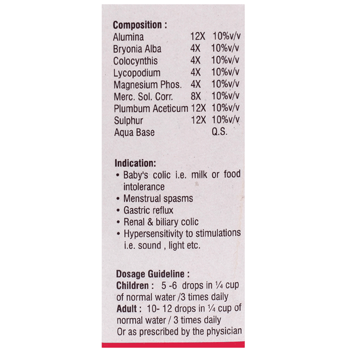 Composition Each 5ml. Contains:lycopodium Clavatum 1x 1.00 Ml.alumina 3x 0.75 Gm.bryonia Alba 3x 0.75 Gm.mercurius Corrosivus 3x 0.75 Gm.colocynthis 3x 0.50 Ml.sulphur 3x 0.50 Ml.magnesium Phosphoricum 3x 0.50 Gm.in Aqua Destillata.
